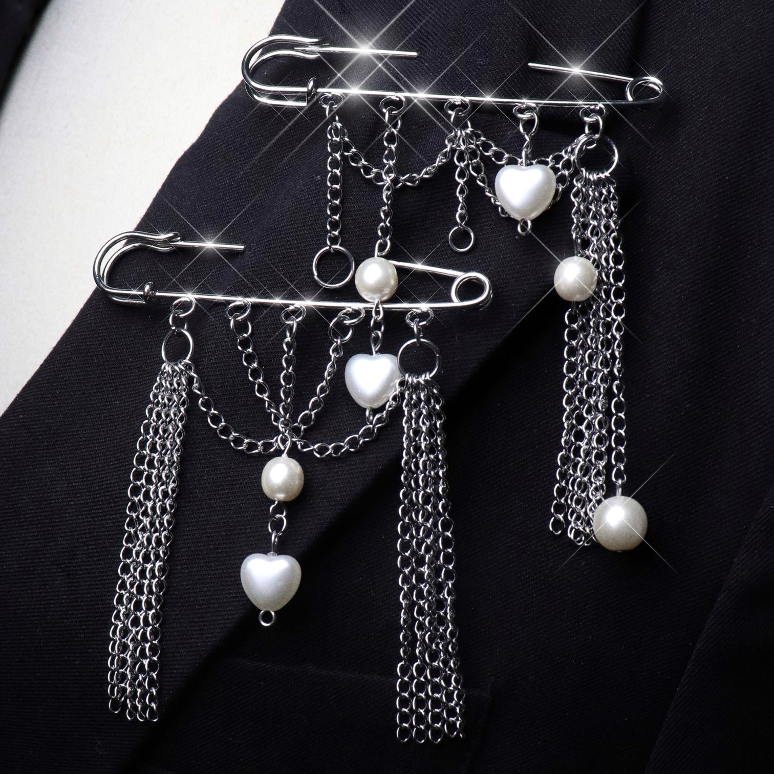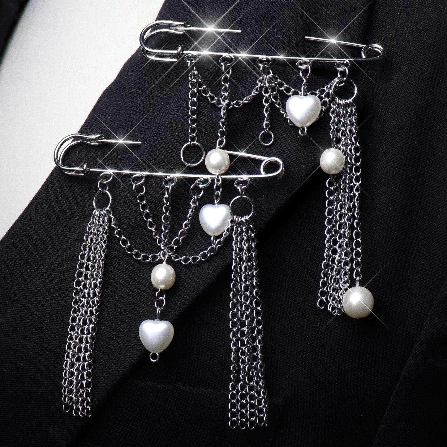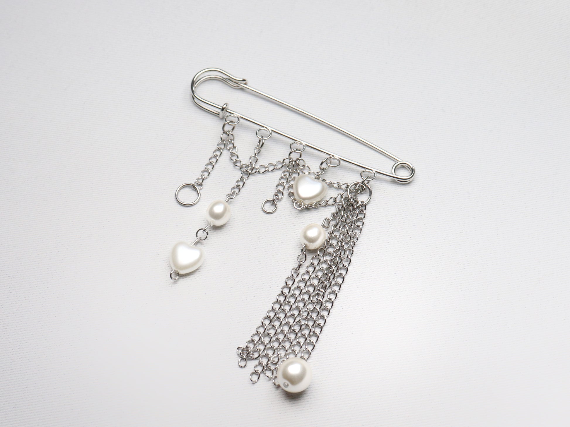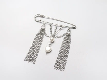 • Safety pin brooch decorated with small chains and white pearl beads