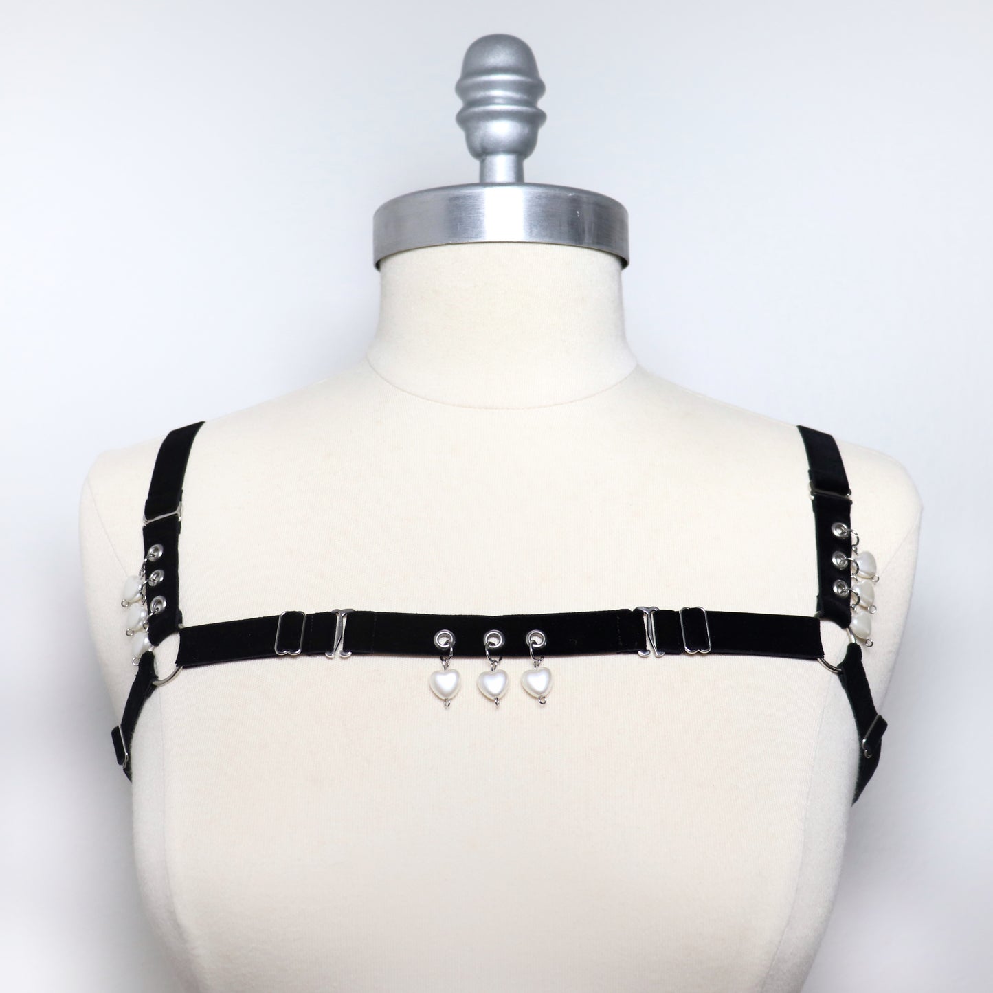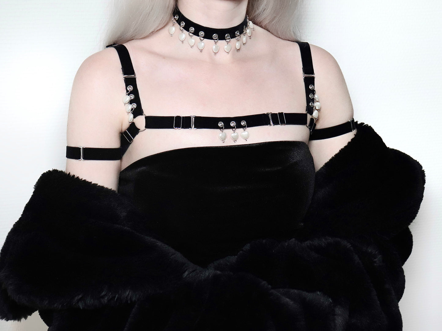 • Mini elastic velvet bust harness, decorated with eyelets and heart-shaped beads, with optional arm cuffs