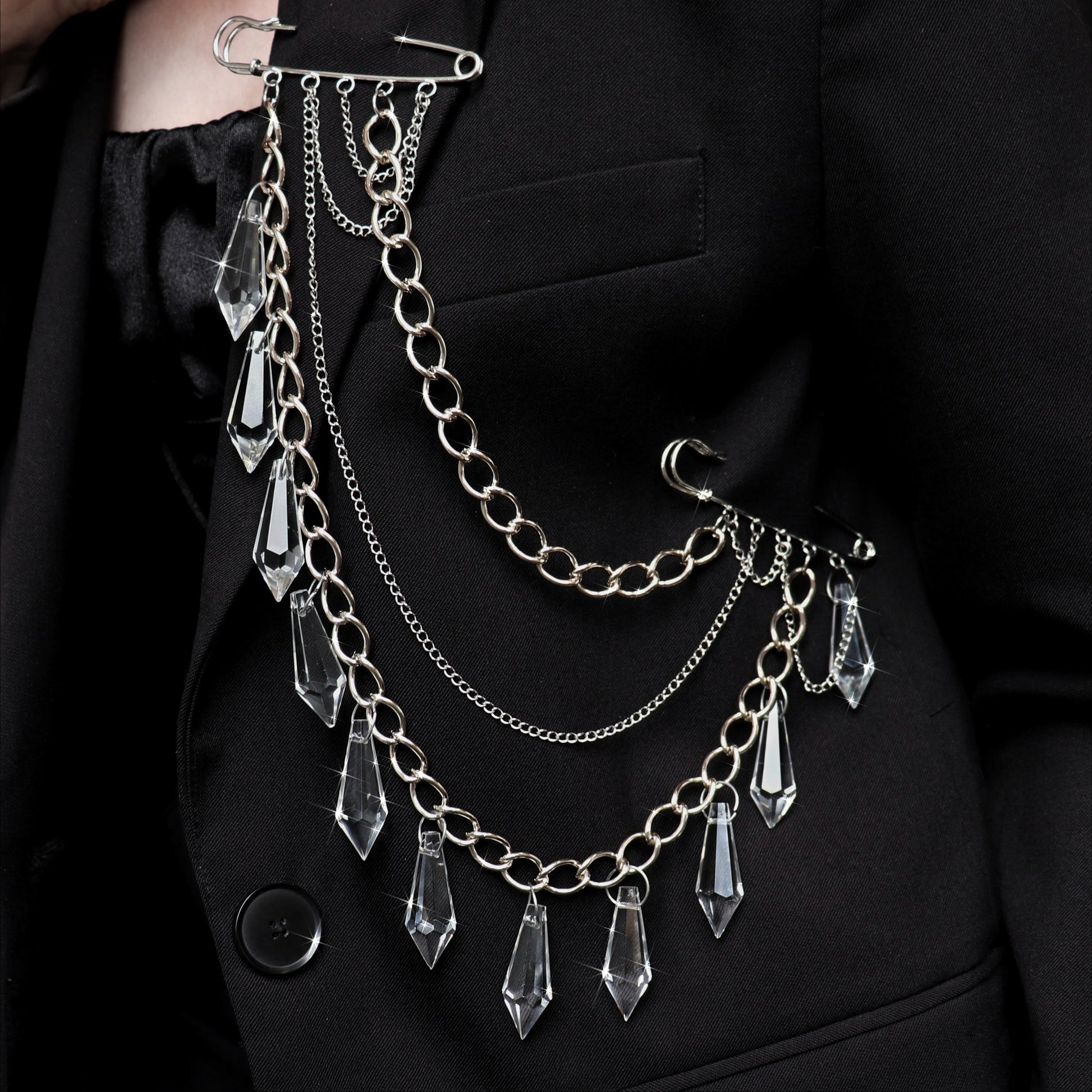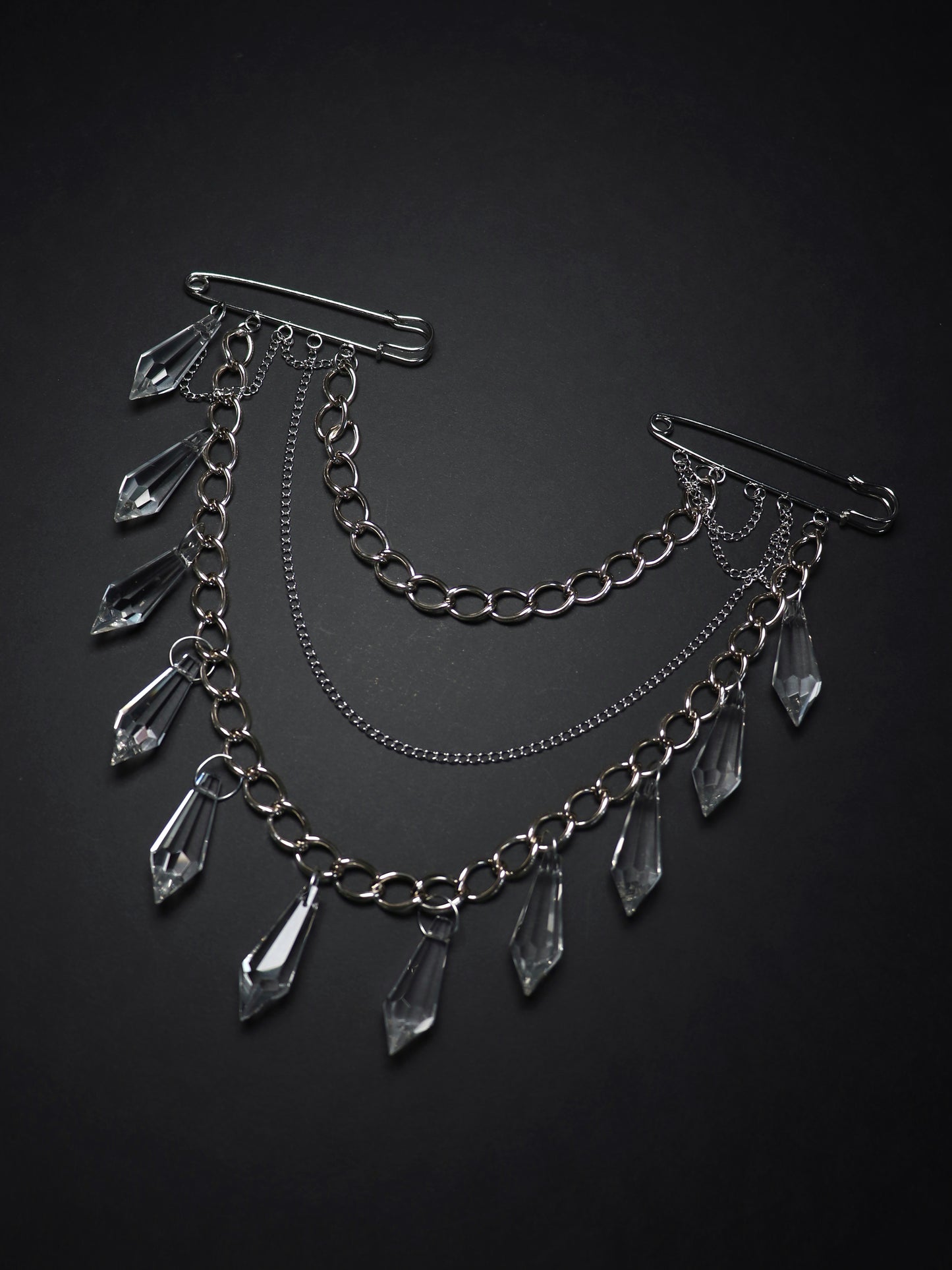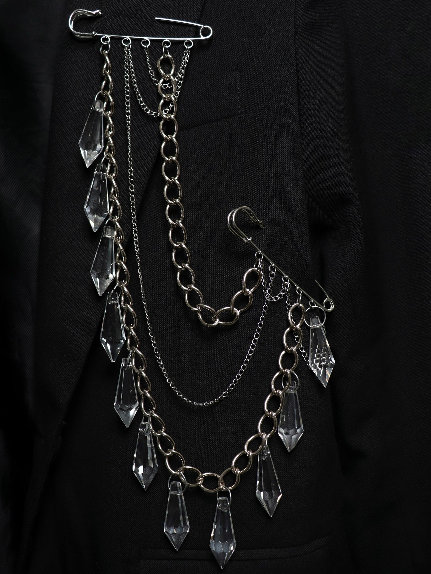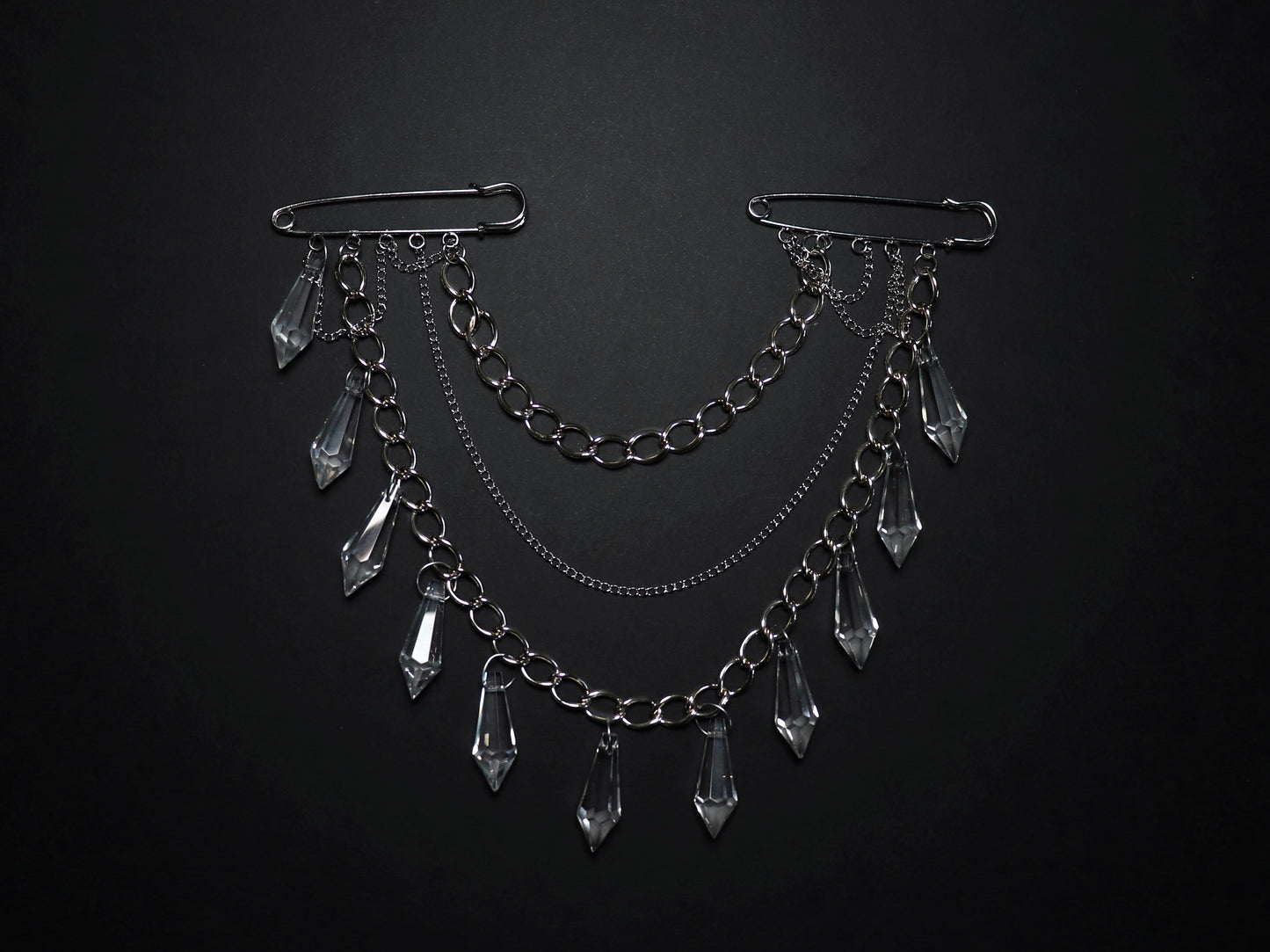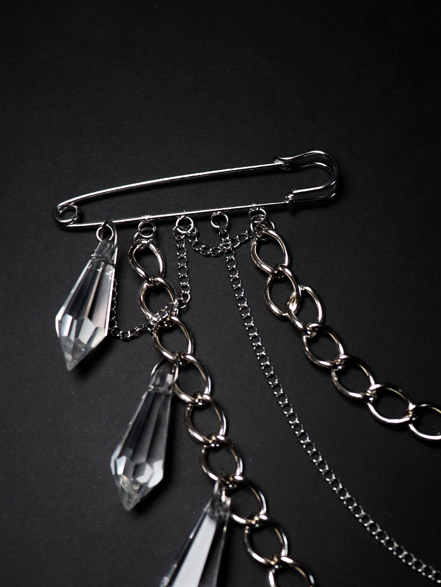 • Broche composée de deux épingles à nourrice, de chaînes et de pendentifs en verre transparent