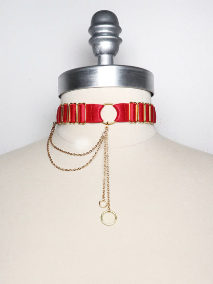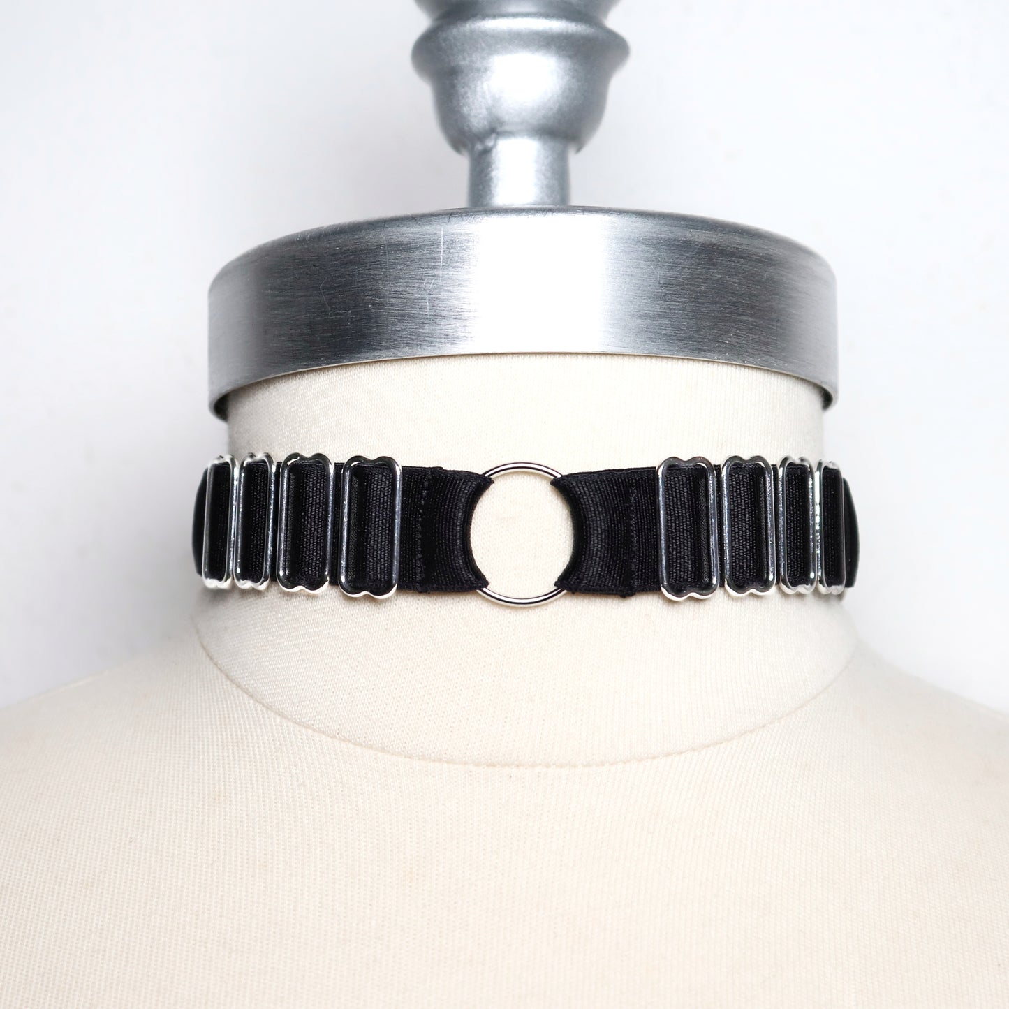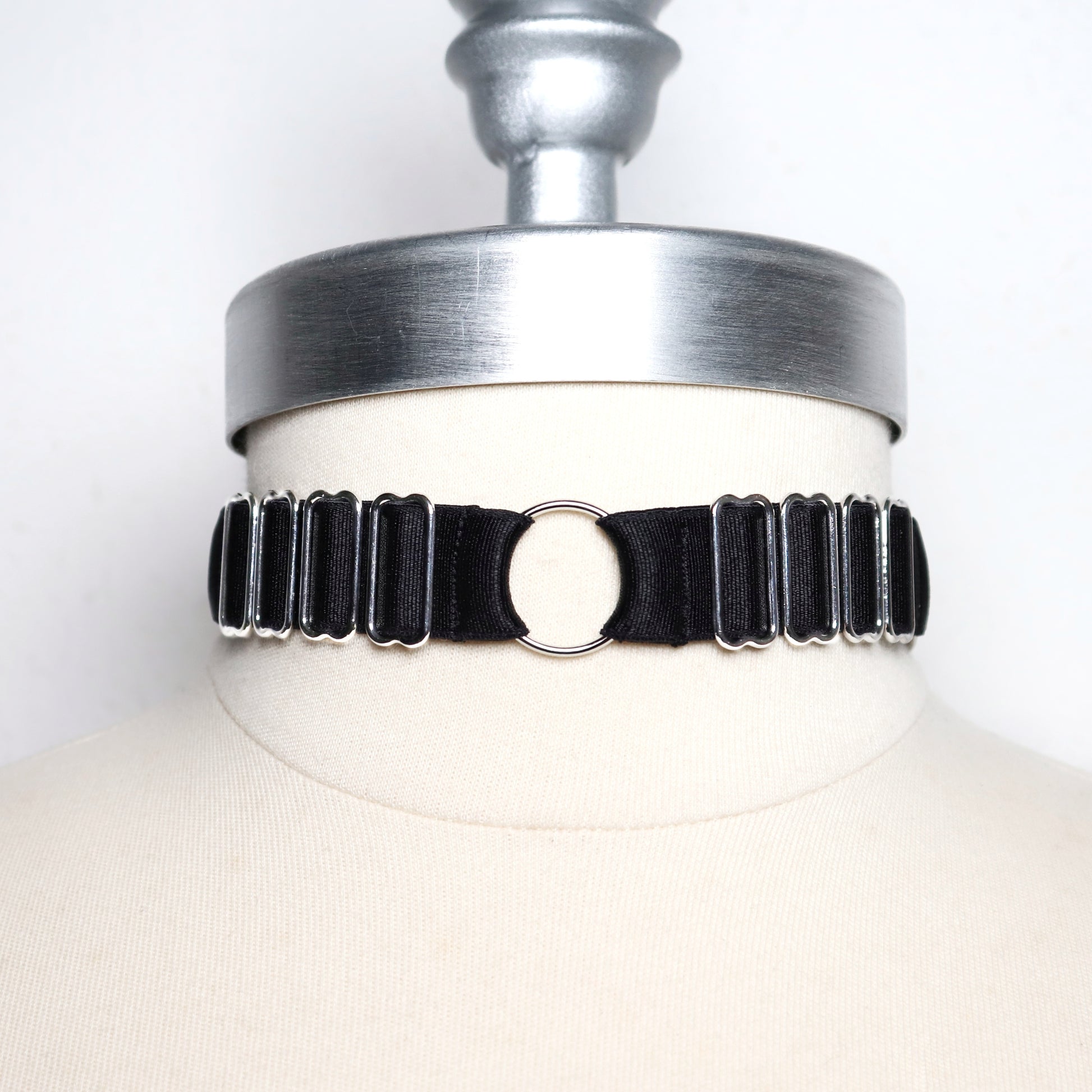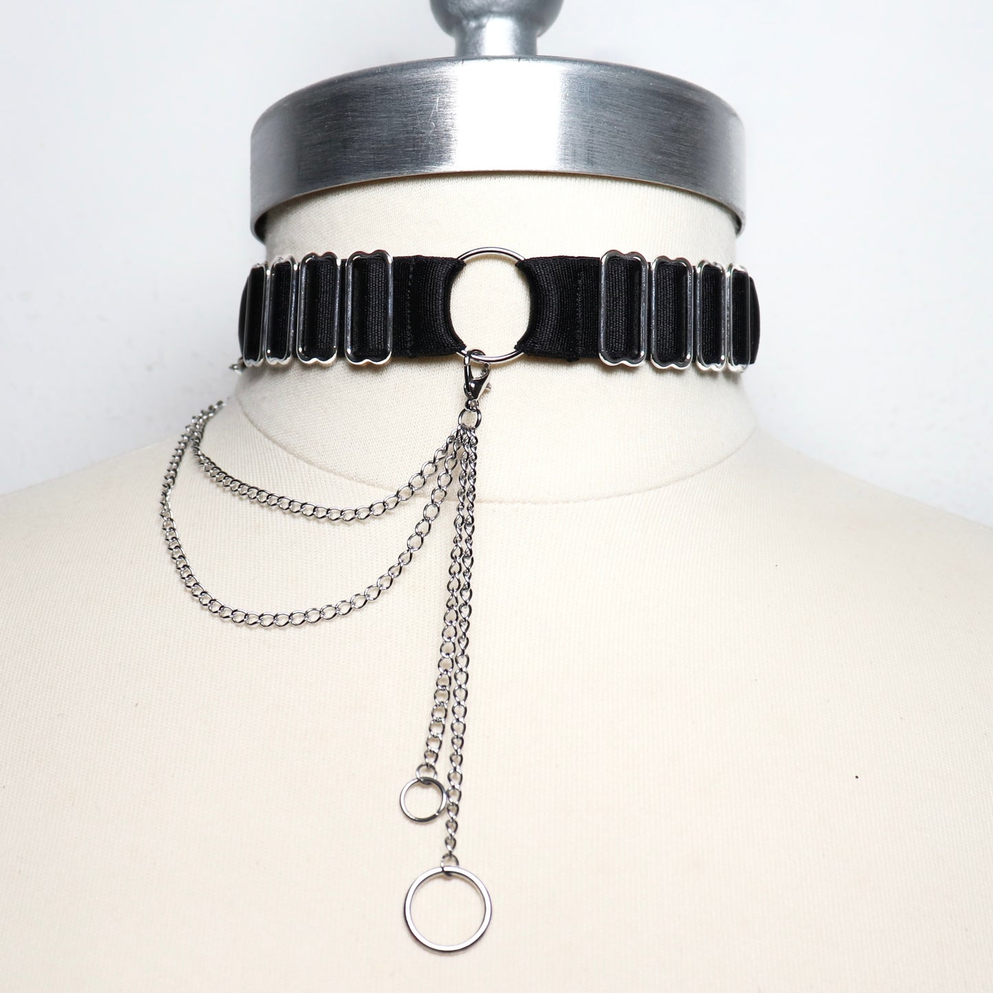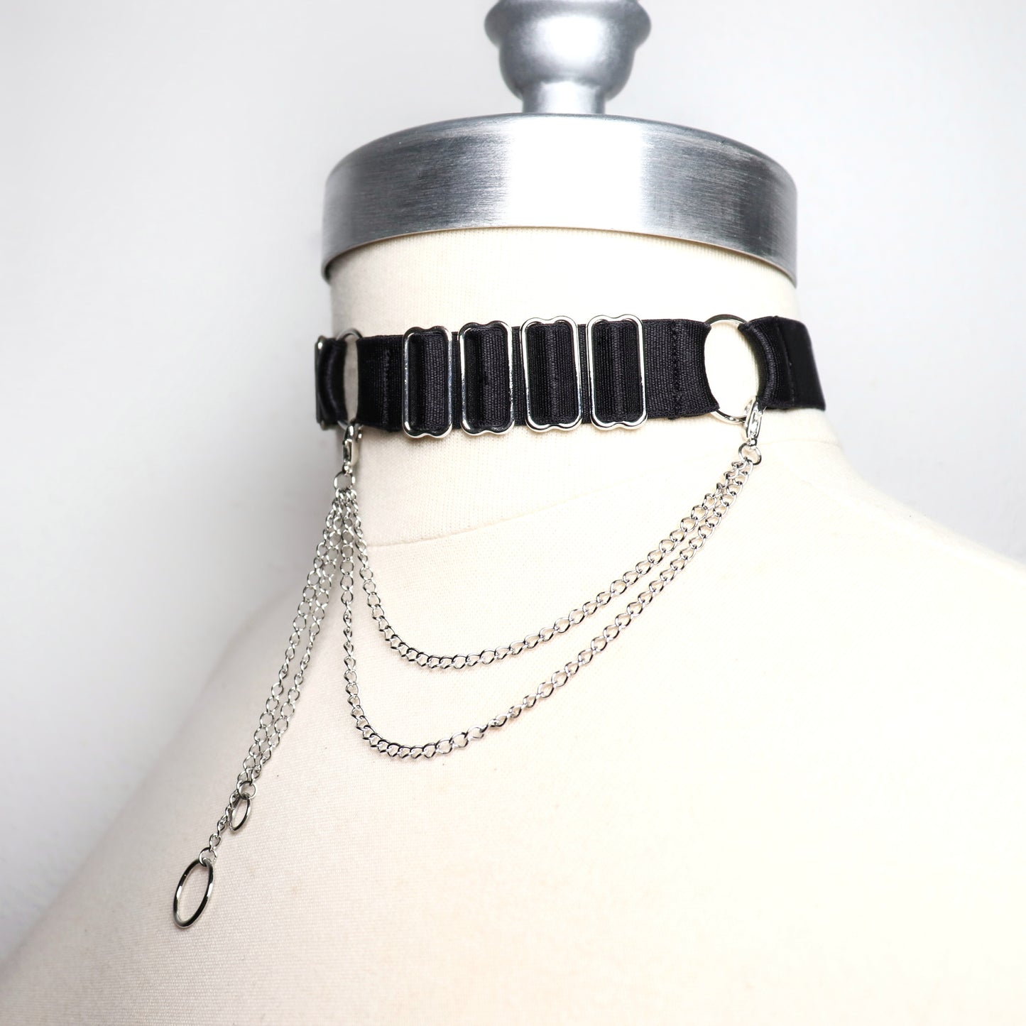 • Choker en élastique satiné, orné de petits anneaux, de régleurs et de chaînes amovibles en acier inoxydable
