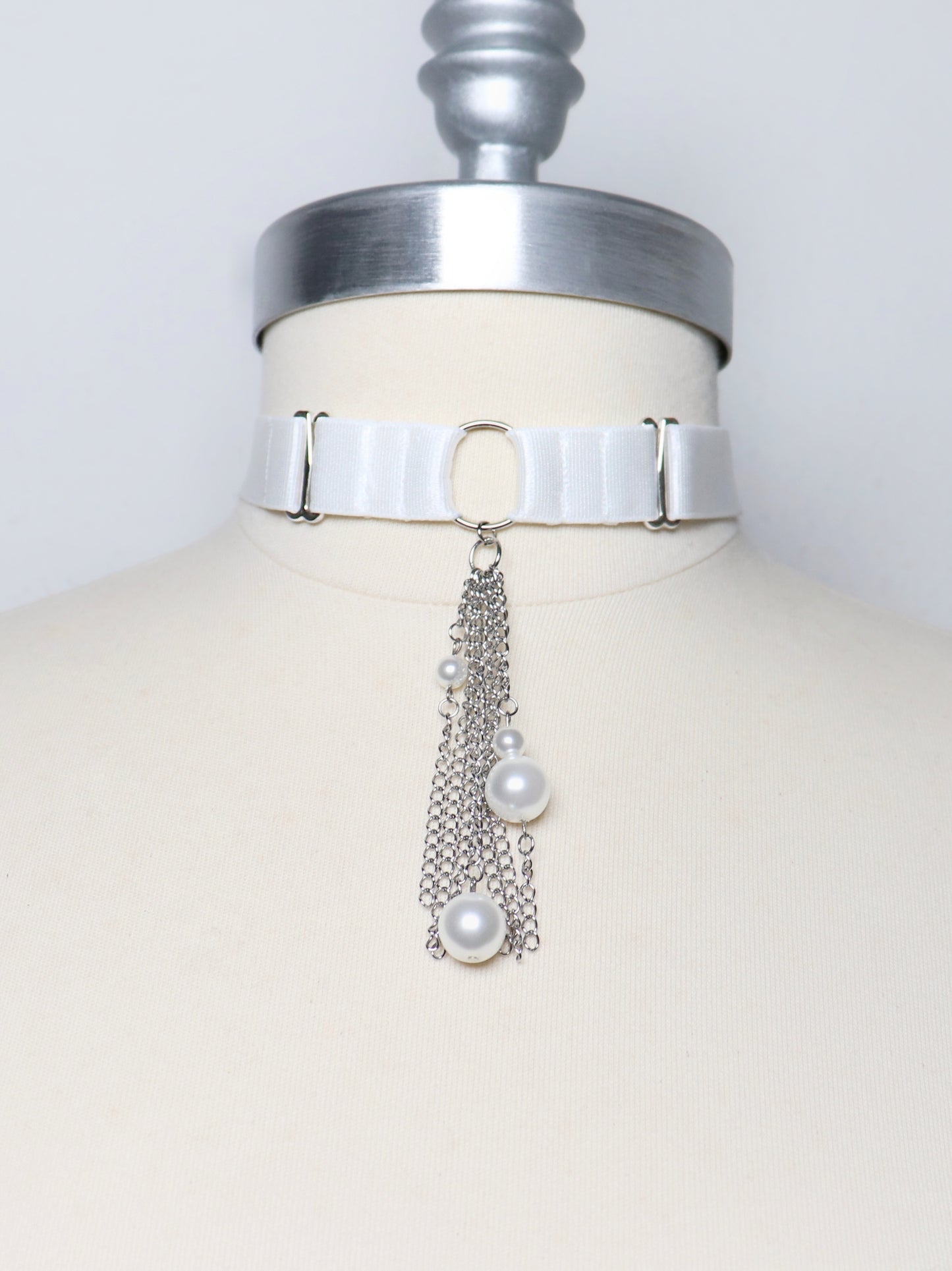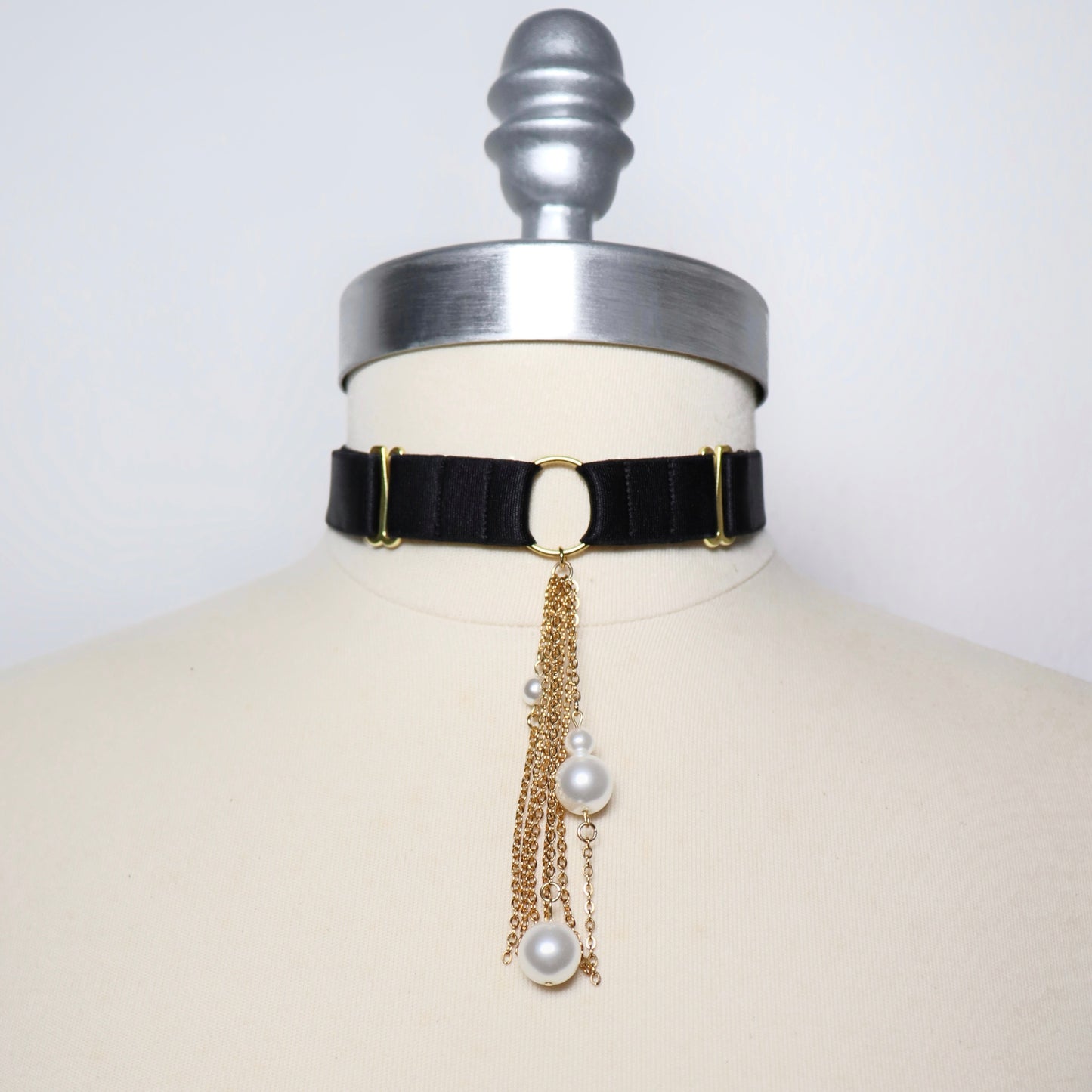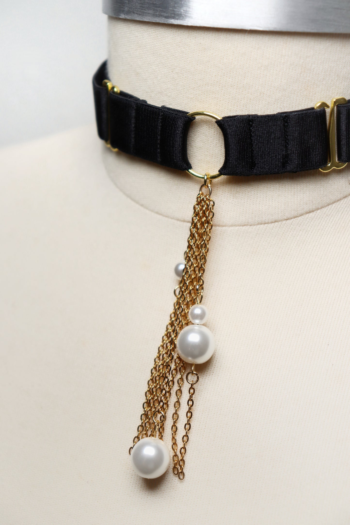 • Choker en élastique satiné décoré de petites chaînes en acier inoxydable et de perles en verre