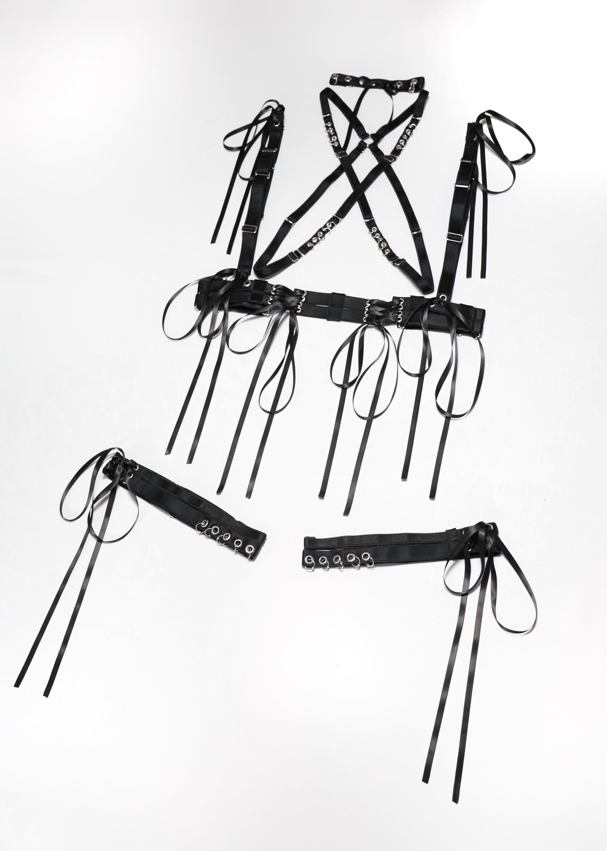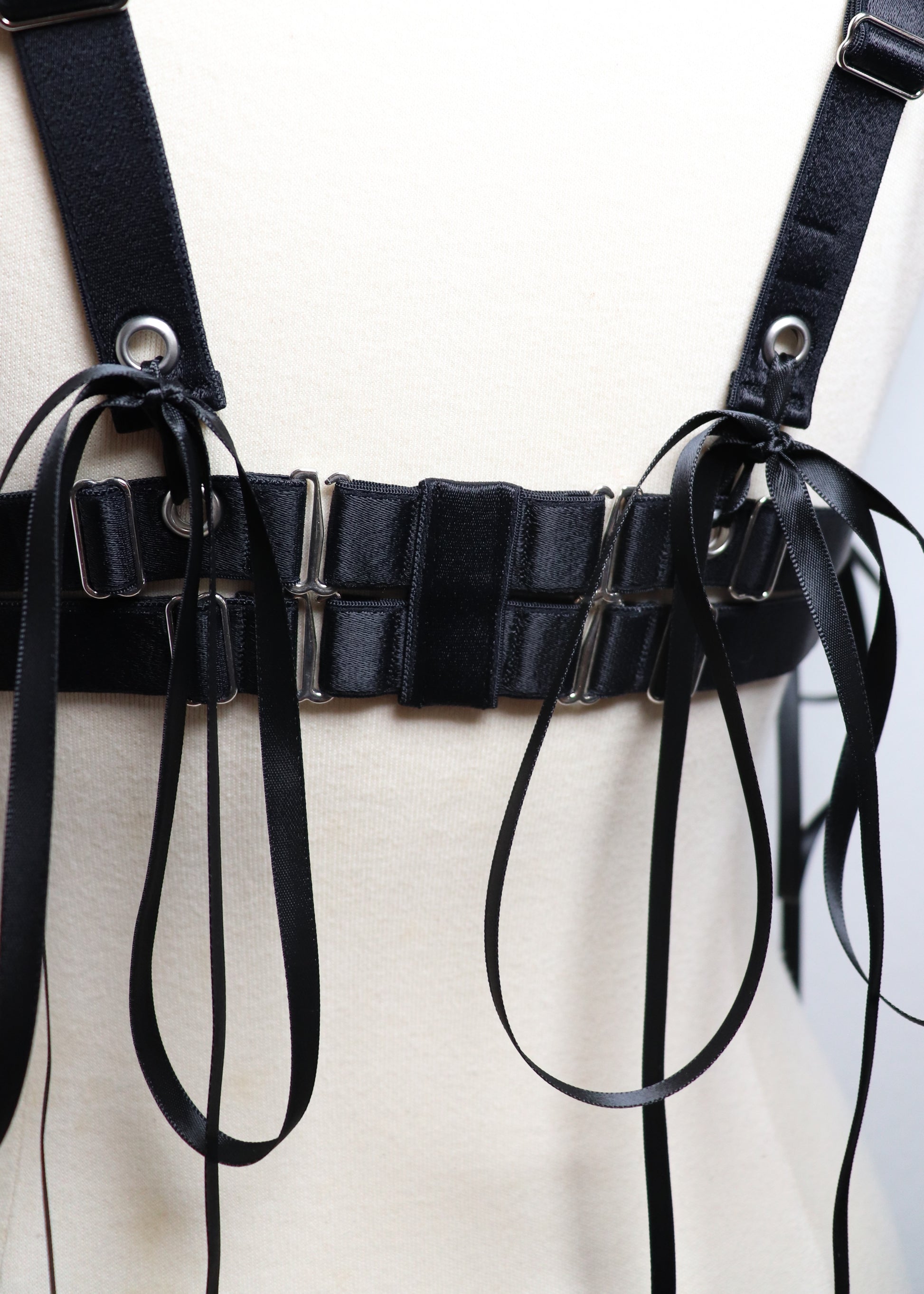 • Harnais inspiration corset en élastique satiné, orné de laçages et de nœuds en satin