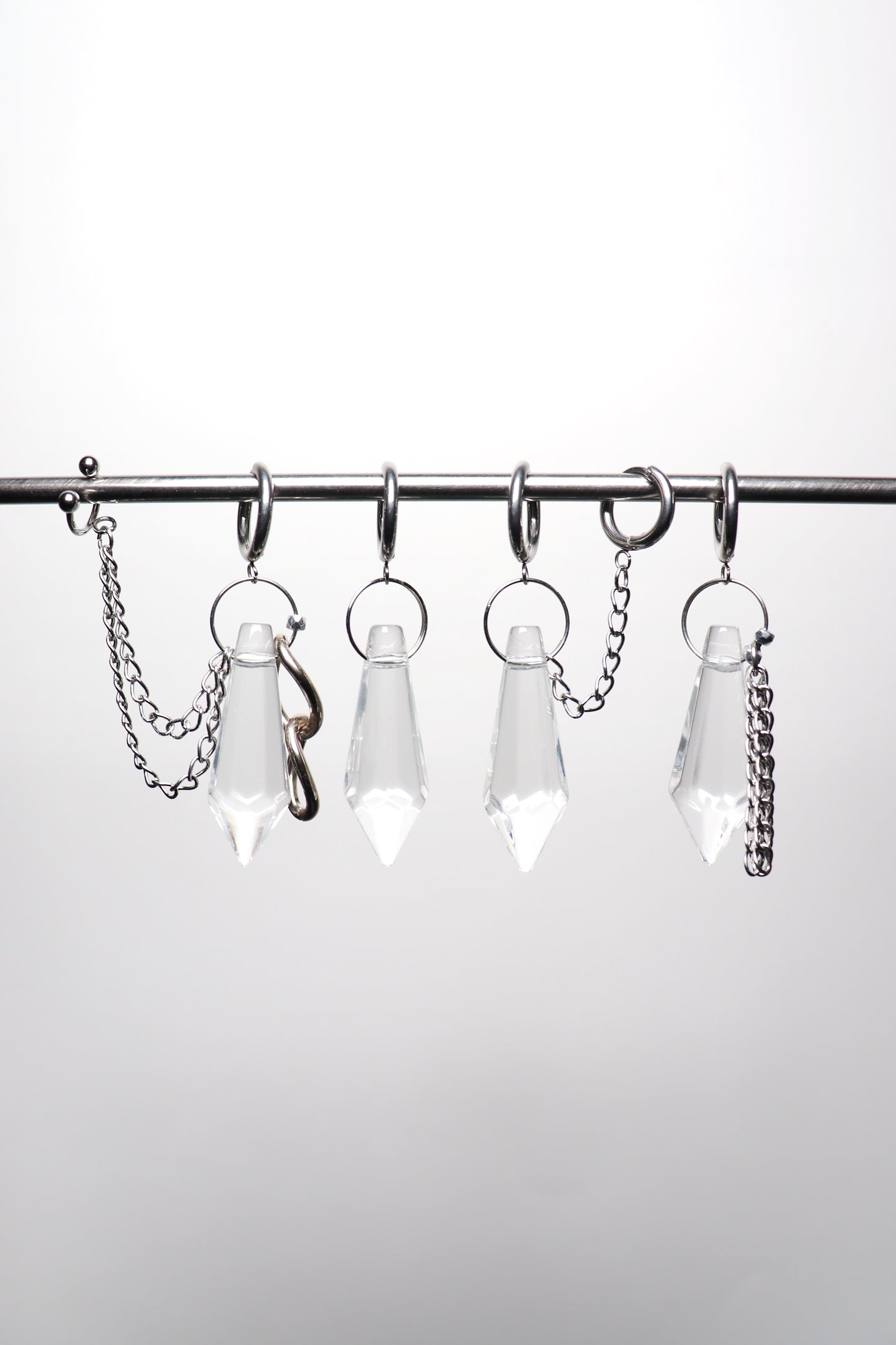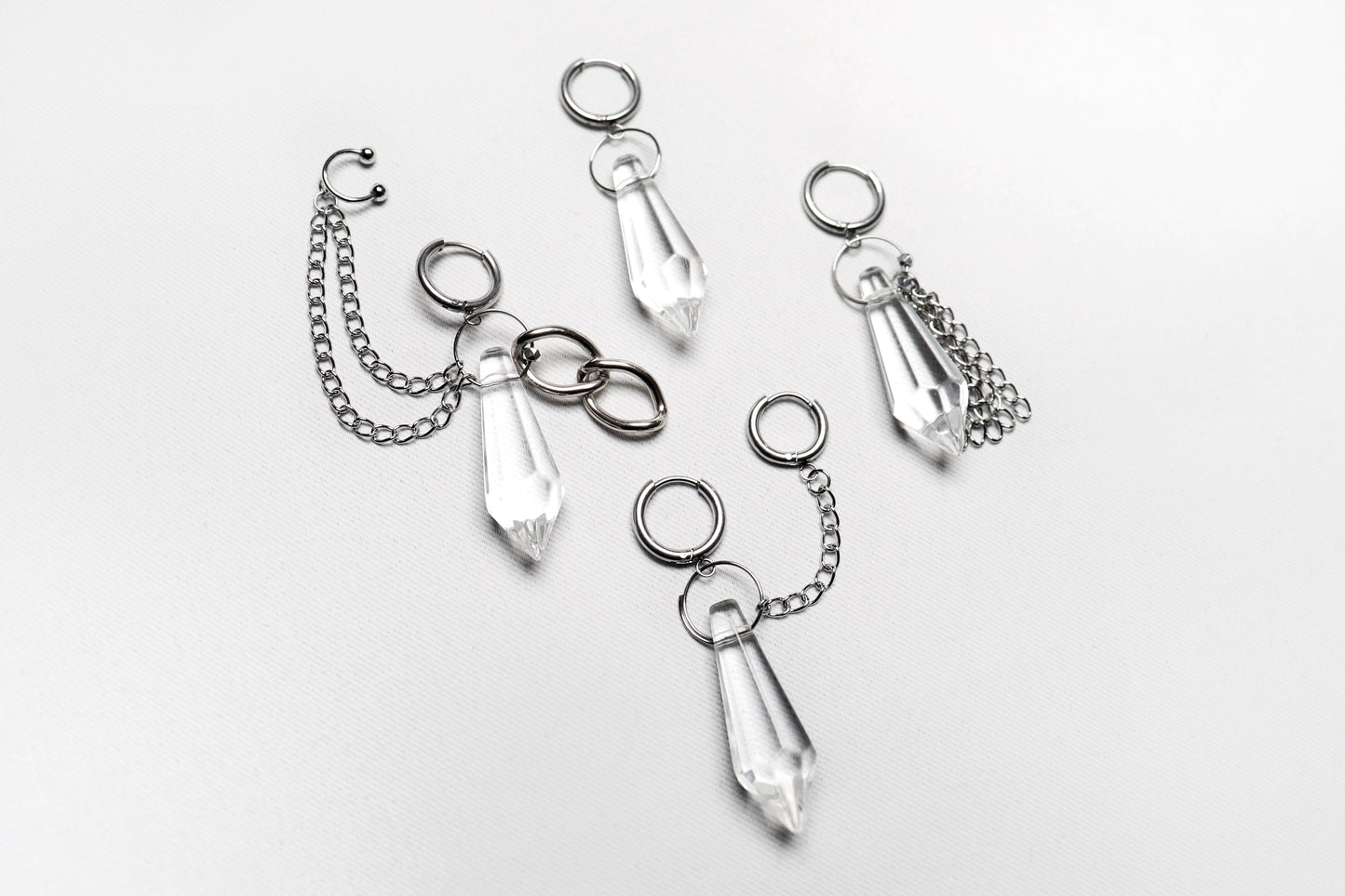 • Deux petits anneaux (12 mm et 14 mm de diamètre extérieur) reliés par une petite chaîne (3 cm de long, personnalisable sur demande par message privé) et décoré d’un pendentif en verre. Convient aux personnes ayant plusieurs piercings au lobe