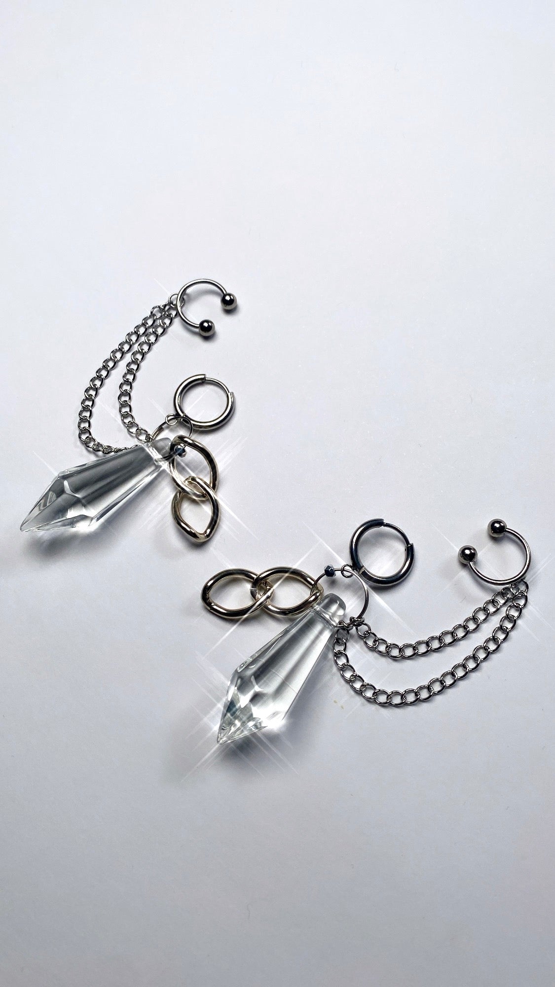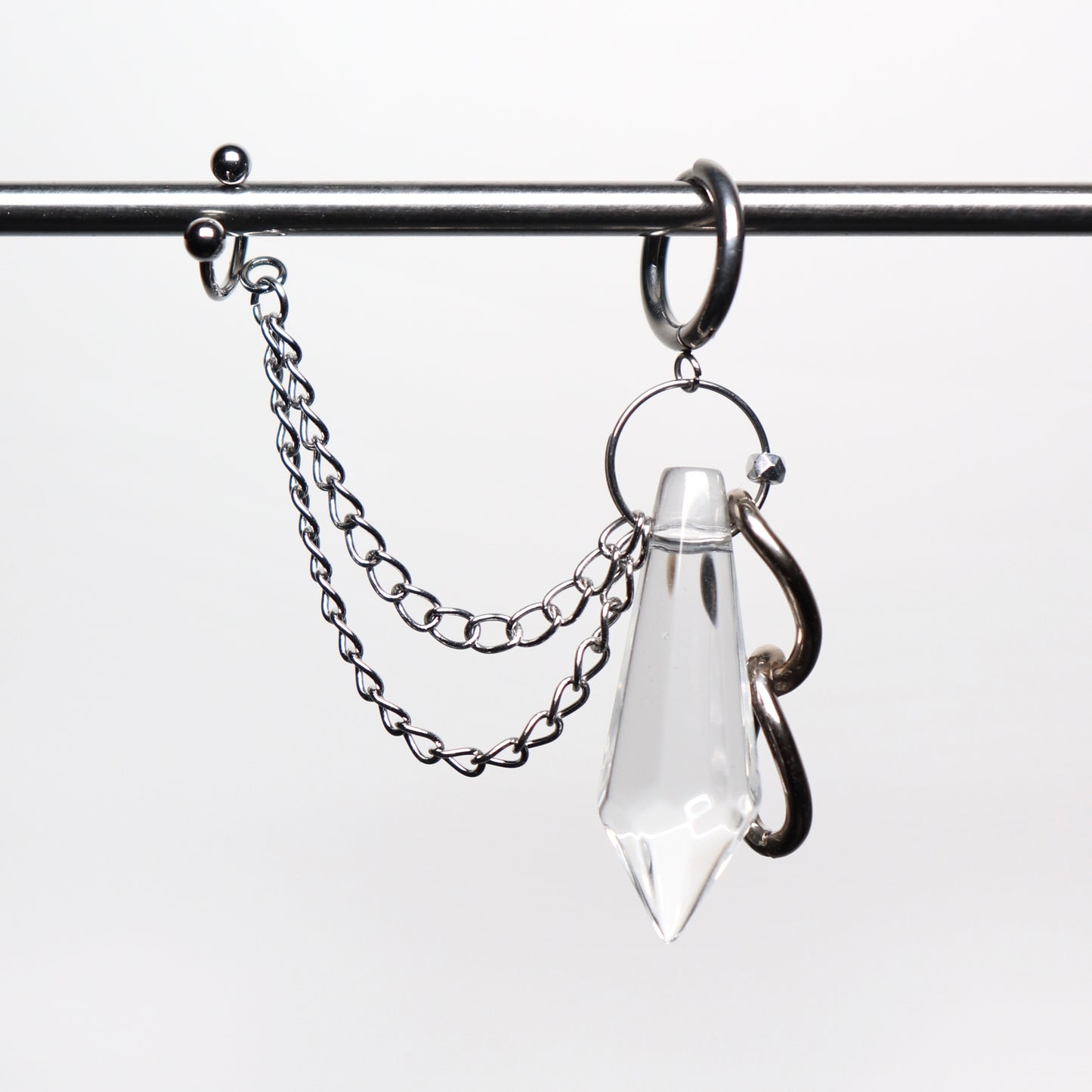 • Boucle d’oreille avec petit anneau (14 mm de diamètre extérieur) ornée d’un pendentif en verre, de chaînes et d’un ear cuff style piercing